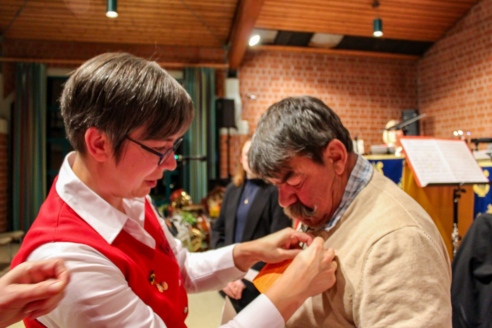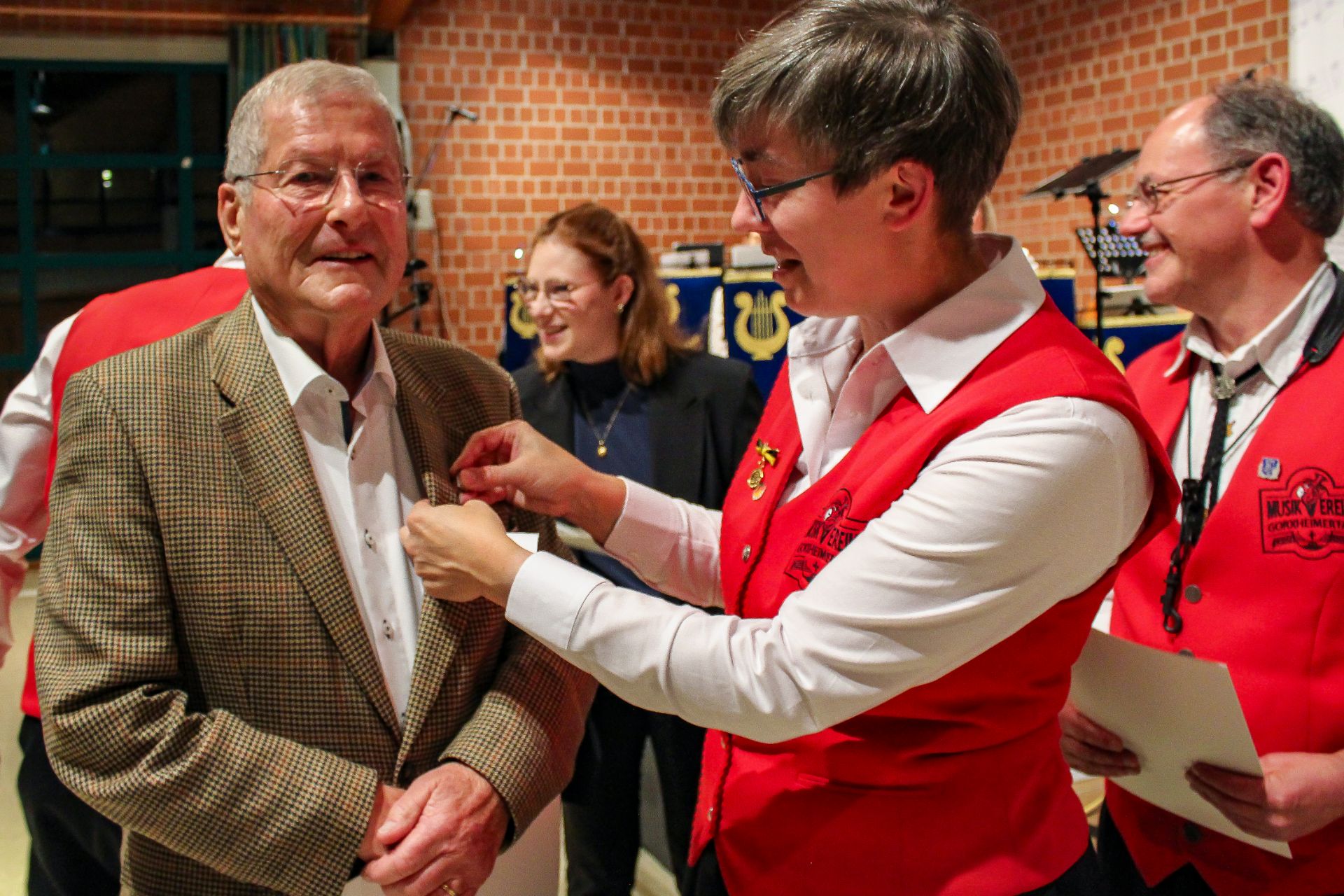 Ein Höhepunkt des Abends waren die Ehrungen verdienter Musikerinnen und Musiker durch Verbandsdirigentin Finja Sophie Nagel: Sie ehrte Ingo Kunkel und Jan Größl für 10 Jahre aktive Tätigkeit im Verein mit der Ehrennadel in Bronze des Blasmusikverbandes Baden-Württemberg. Für 20 Jahre erhielt Sven Rischer die silberne Ehrennadel des BVBW, Christoph Flößer wurde für 30 Jahre aktiver Tätigkeit mit der Ehrennadel in Gold und Urkunde gewürdigt, Monika Flößer freute sich über die Ehrennadel in Gold mit Urkunde für 40 Jahre aktive Mitgliedschaft. Für sage und schreibe 50 Jahre Aktivität wurden Frank Heckmann, Wolfgang Jungels, Armin Schlag und Friedrich Schmitt mit der Ehrennadel in Platin und Urkunde ausgezeichnet.