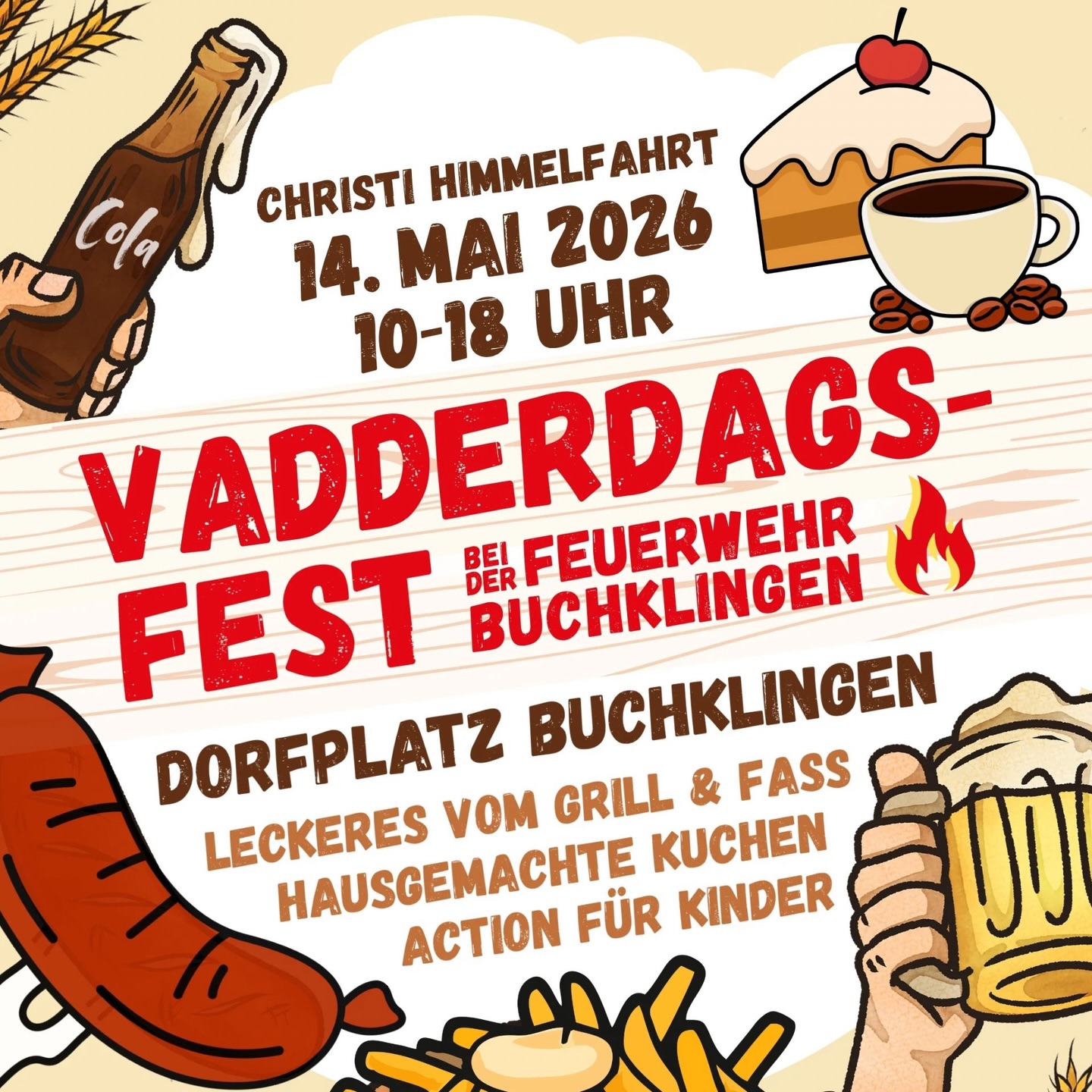 Am 14. Mai (Christi Himmelfahrt) lädt die Feuerwehr Buchklingen ab 10 Uhr ein zum Vadderdagsfest auf dem Dorfplatz in Buchklingen. Für das leibliche Wohl ist bestens gesorgt: Es gibt Grillwurst, Pommes, Kochkäs’ mit Musik und ofenfrische Laugenstangen. Ab 12 Uhr gibt’s hausgemachten Kuchen und Kaffee.